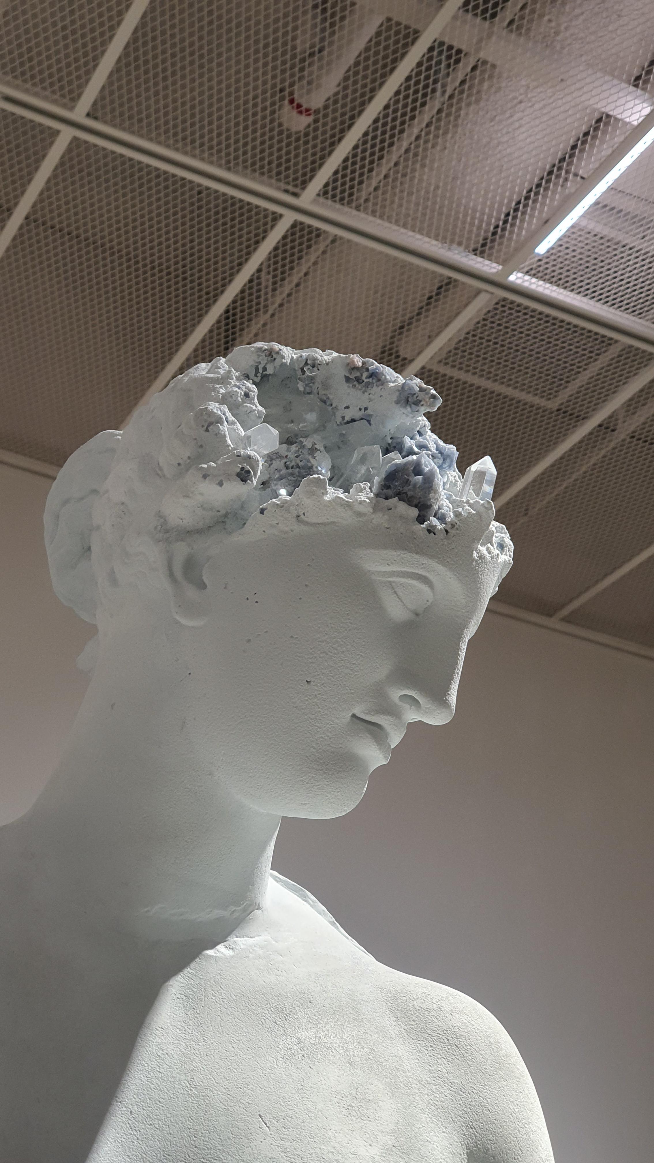 그의 작품은 마치 수천년 전 자취를 감췄다가 이제 막 발굴된 유물들처럼 부패한 듯 보인다. 역사적 조각상들의 몰드를 활용해 만든 작품들은 신체 곳곳이 부식되어 있고 떨어져나간 단면에서는 수정이 솟아나 있다. 마치 새 생명이 자라나는 것처럼. 이는 작가가 인생을 바라보는 시각을 대변한다. 그는 모든 것은 결국 침식되기에 이 세상에 완벽한 존재는 없지만, 동시에 수정과 같이 새로운 것이 자라나는 등 연약함 속에서도 활발한 결합이 일어나고 있다는 점에 주목한다.