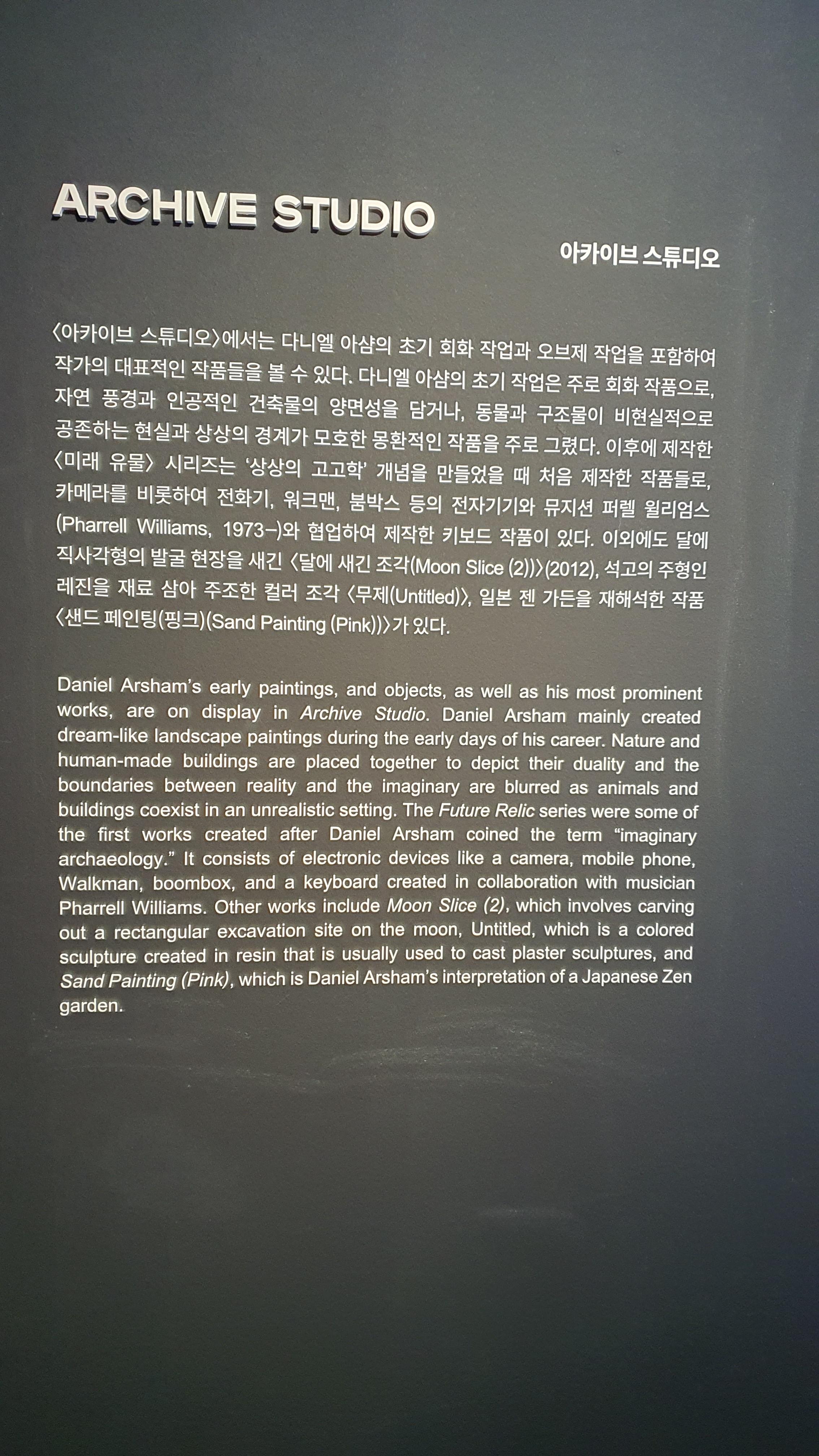 다니엘 아샴의 세계는 전반적으로 차분한 톤으로 구성되며, 장면을 강조하는 것은 명암이다. 이는 부분 색맹인 그가 색의 부재를 빛과 그림자에 대한 탐험으로 치환한 결과다. 작가는 대부분의 작업이나 프로젝트에 메시지 또는 의미를 담지 않는다고 말한다. 그는 그저 자신의 작품을 마주한 이들이 학습된 선형의 시간에서 벗어나 그들이 서 있는 시간적 위치를 상상해 보길 바랄 뿐이다. 이러한 맥락에서 등장하는 것이 바로 다니엘 아샴의 세계를 이루는 주요 개념인 ‘가상의 고고학(fictional archeology)’이다.