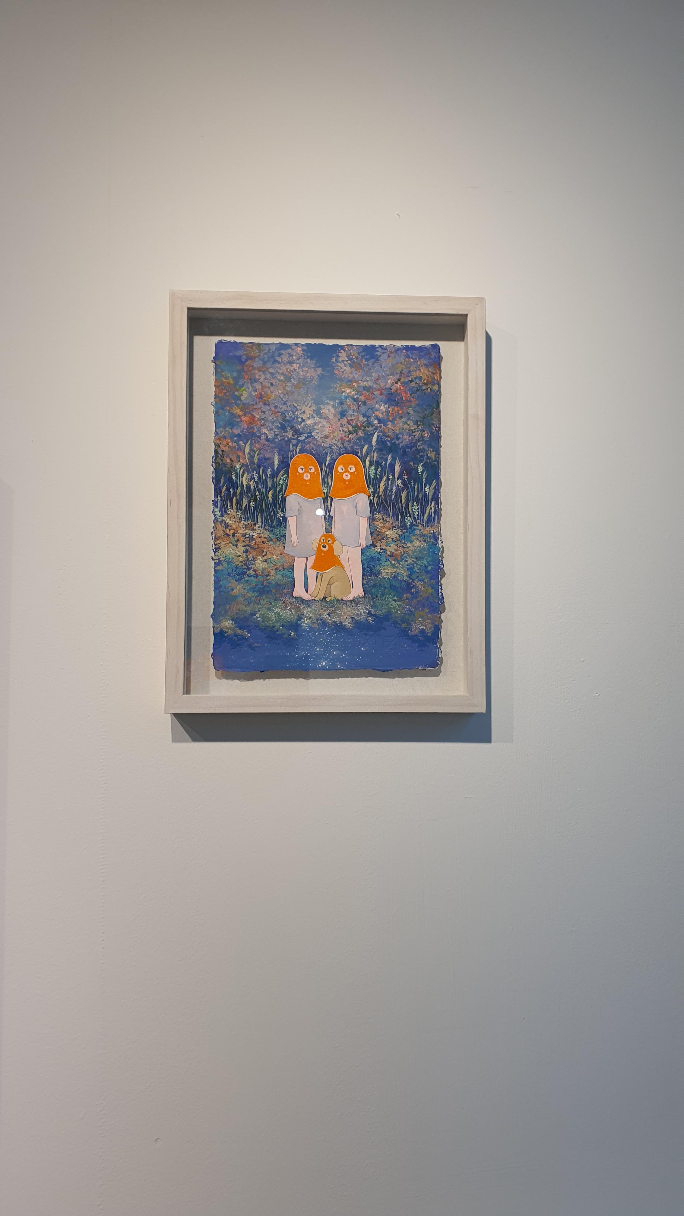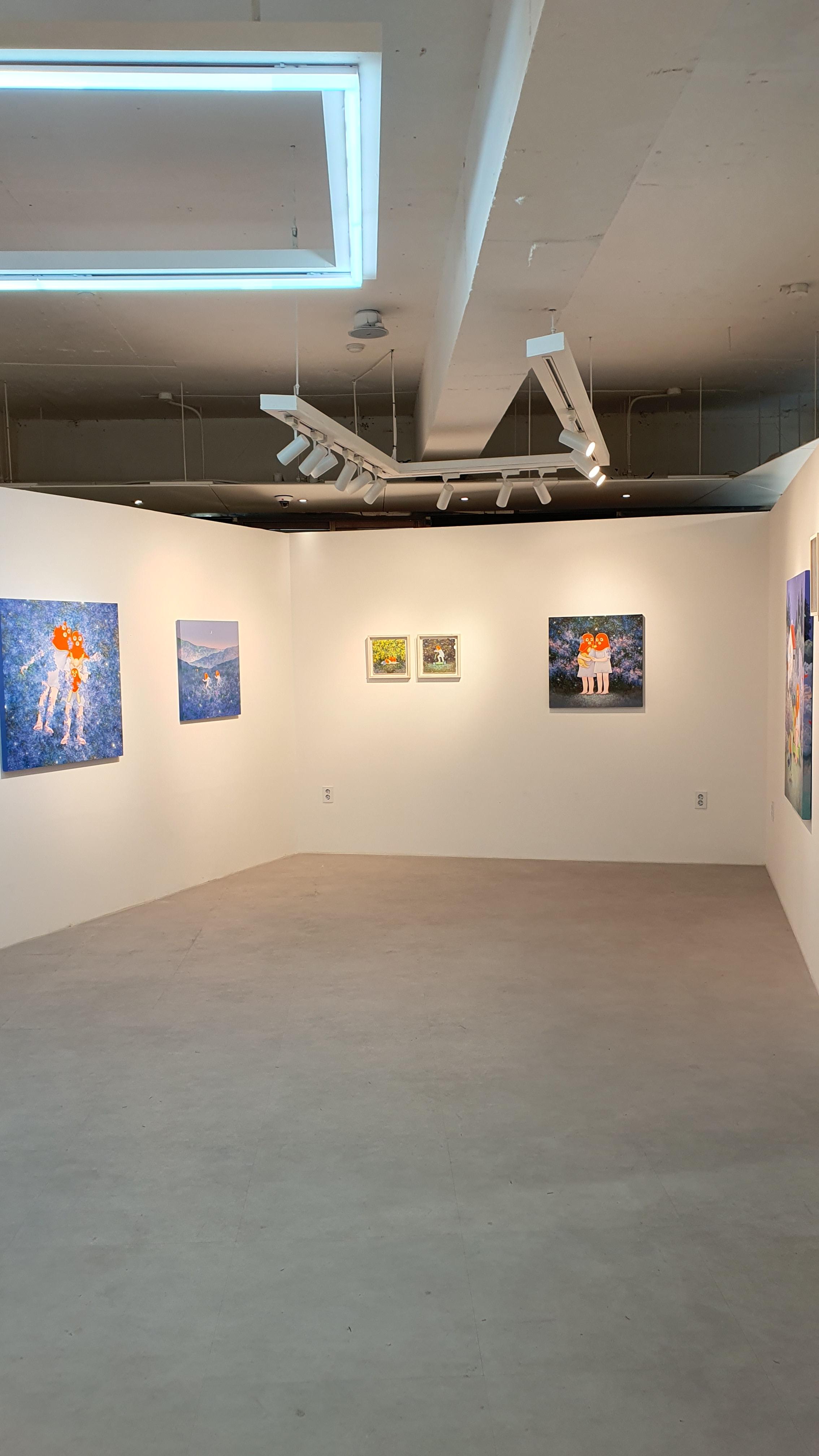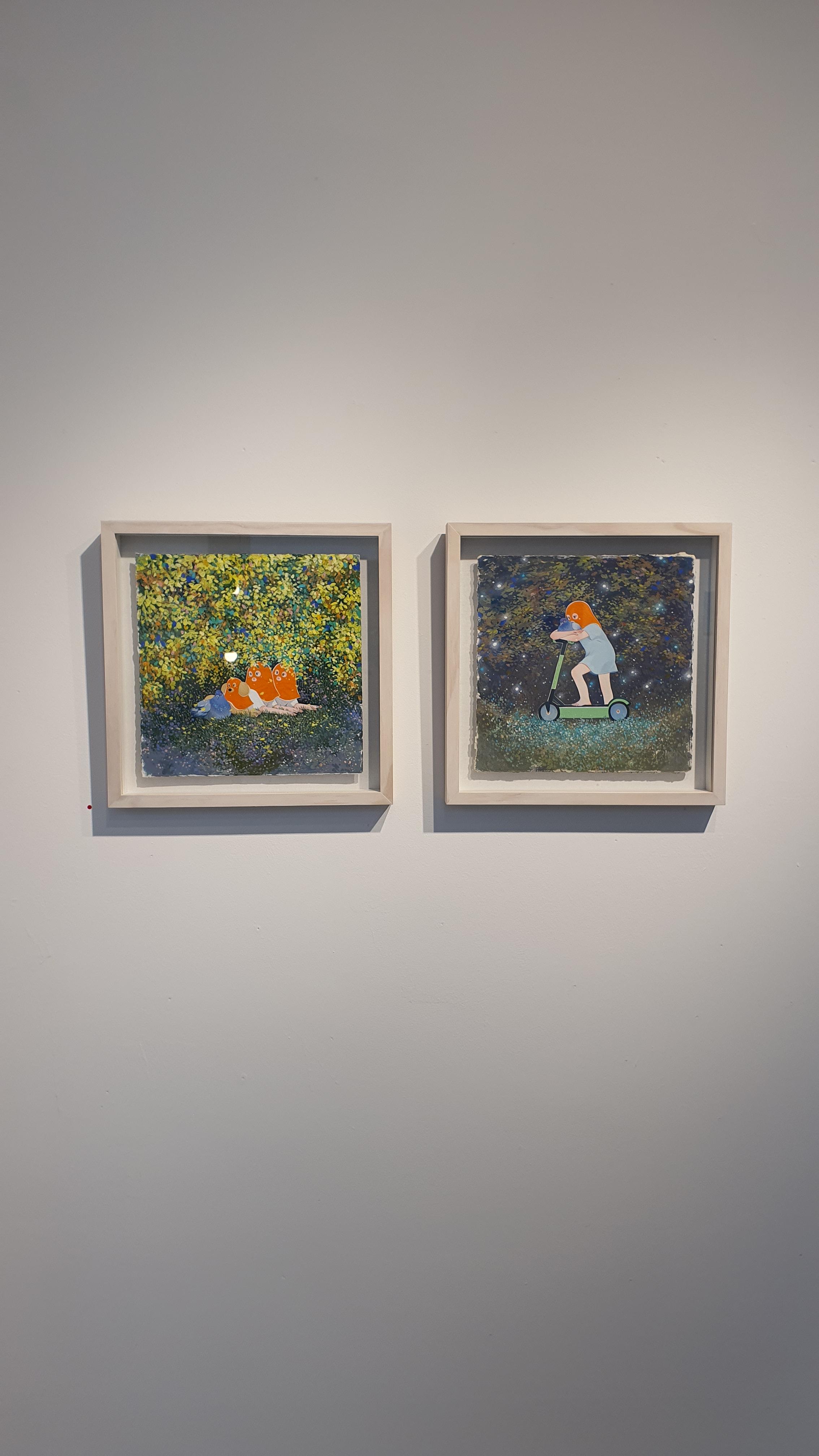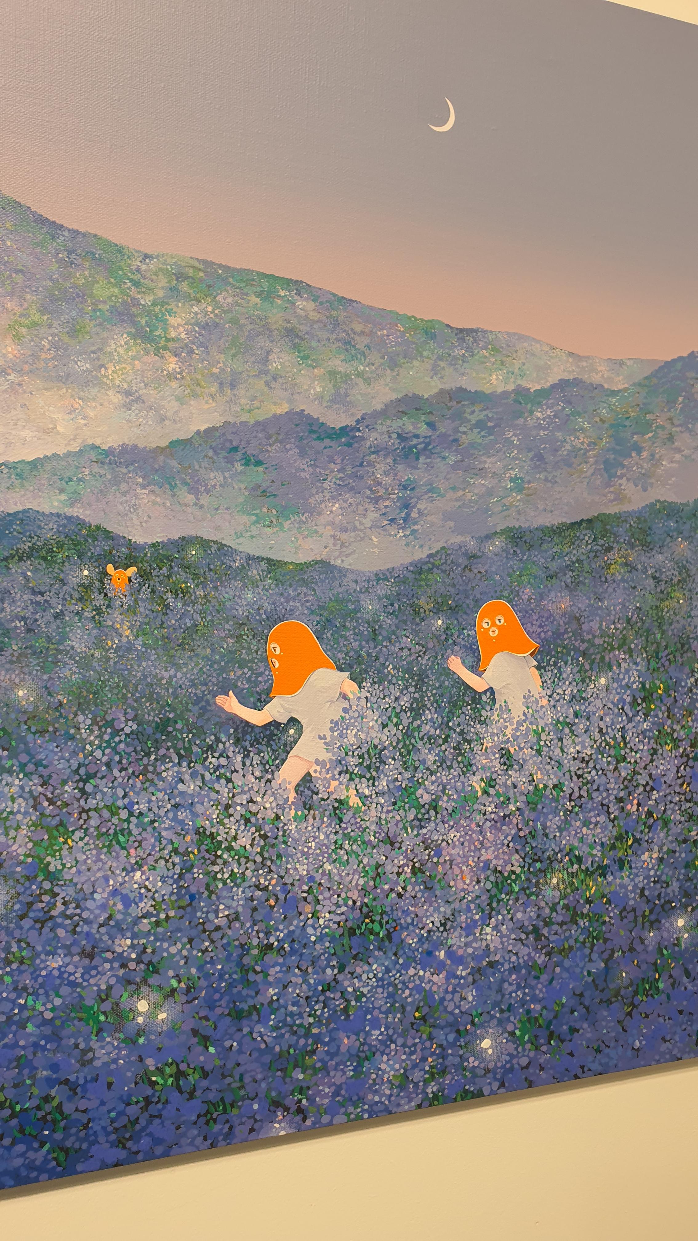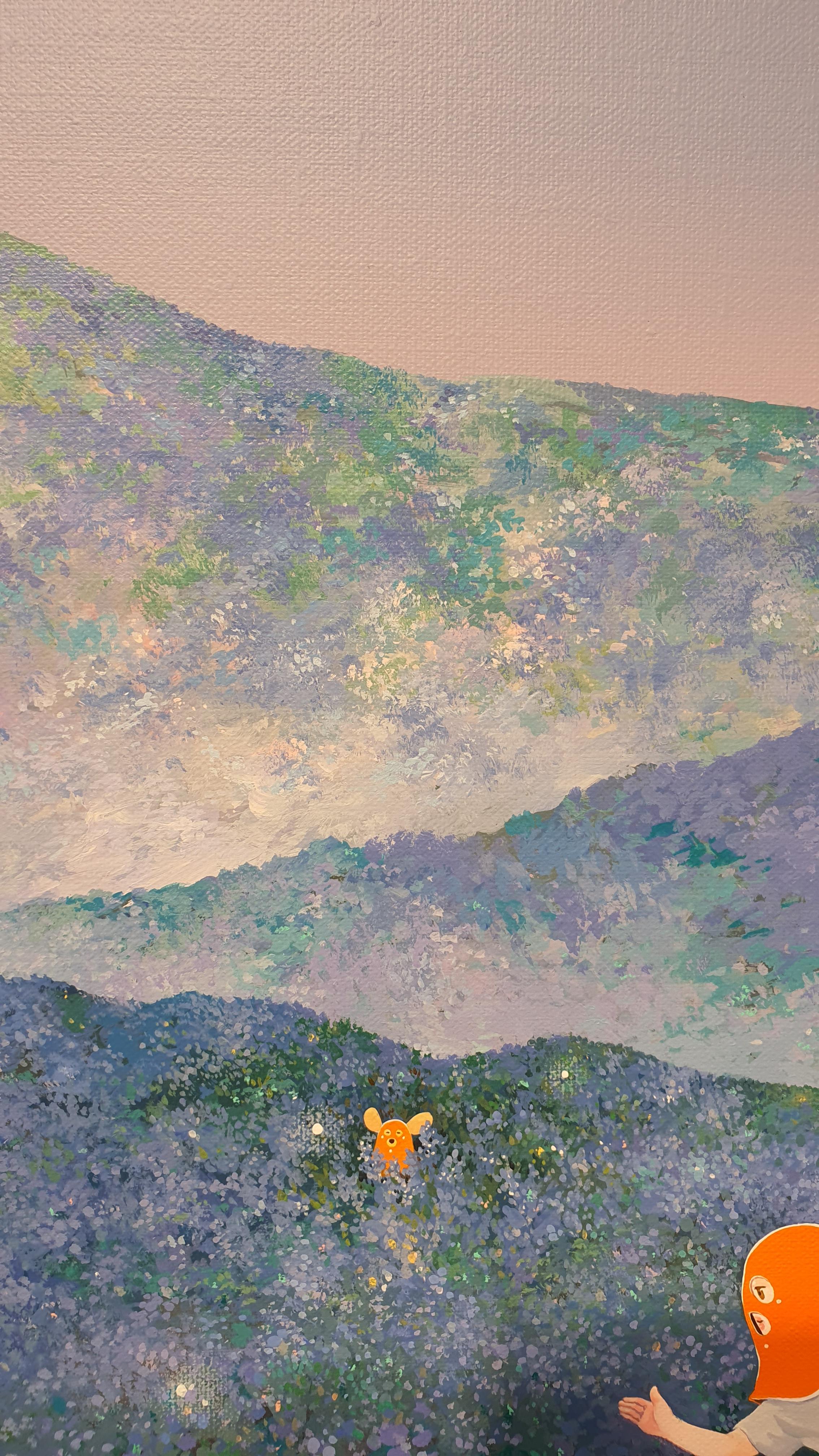 작가의 <Twisted World> 연작의 이전 작업에서 시선을 사로잡았던 것은 넓은 면적의 파란 바탕과 색연필로 긁어 효과를 주었다는 부챗살 모양을 한 오묘한 빛깔의 식물 군집이었다. 개인전을 거듭할수록 작품의 색은 다채로워지고 복면을 쓴 이들의 옆에 등장하는 존재들이 추가되며 배경은 여유로우면서도 자세하다.