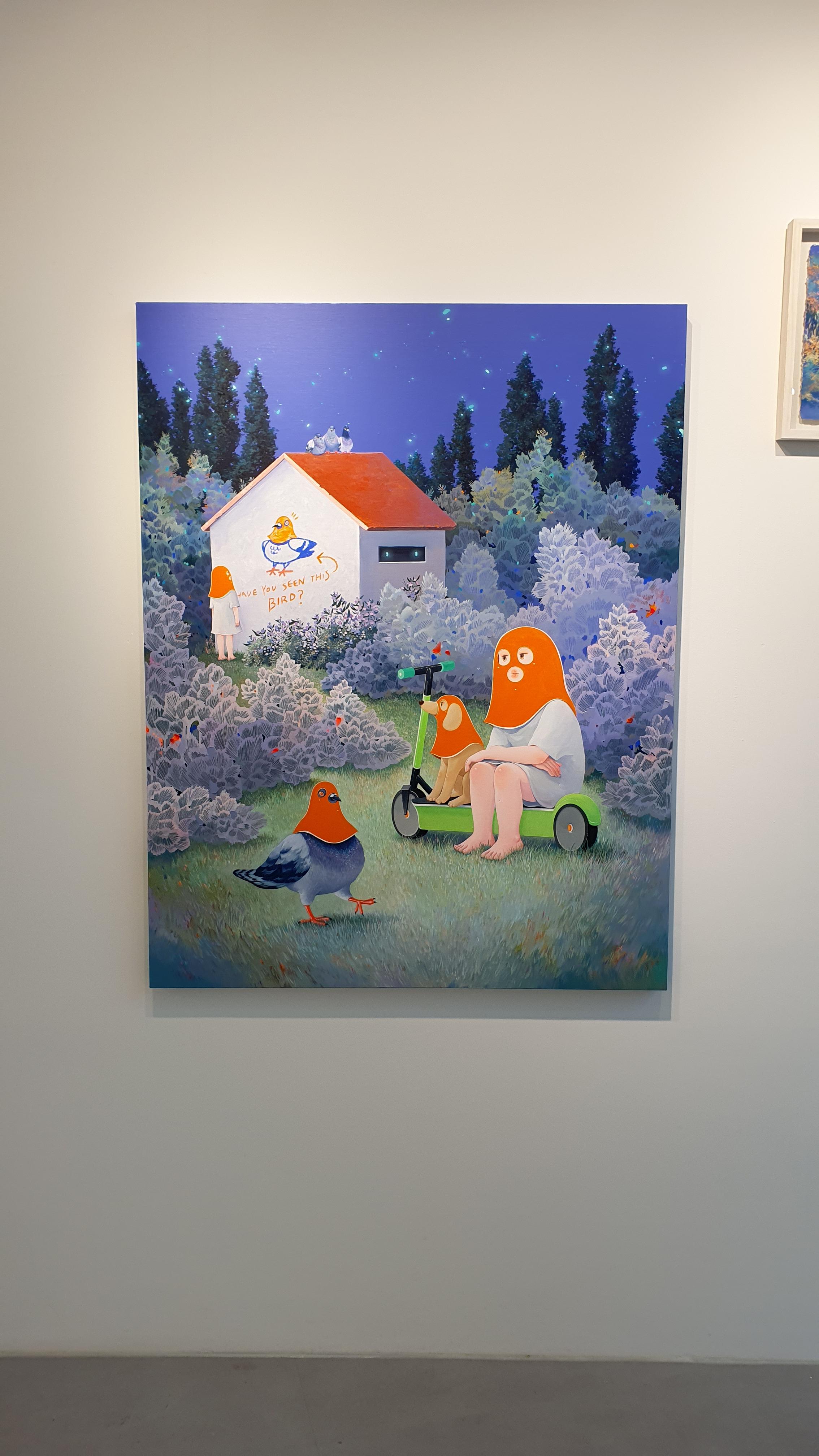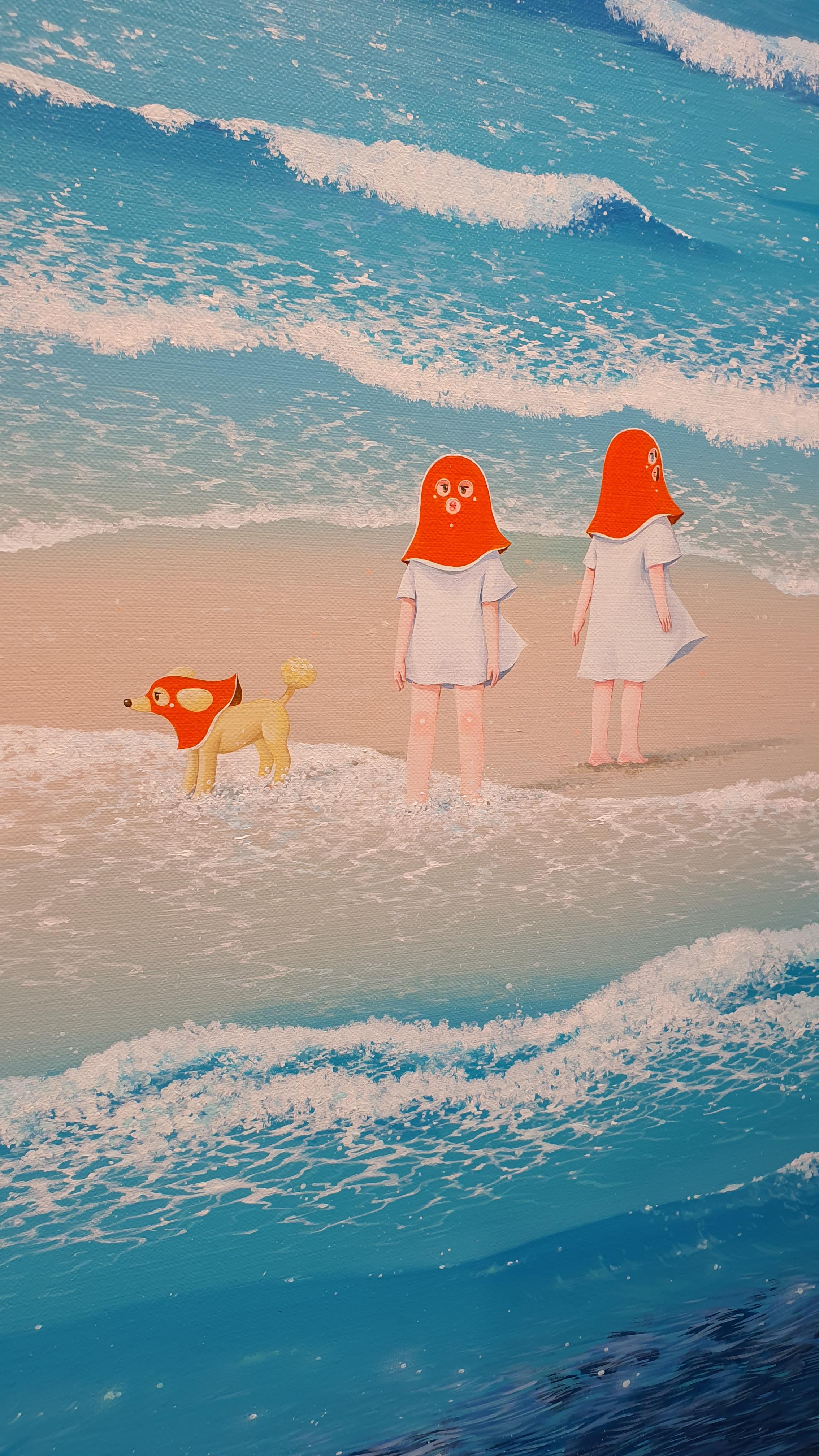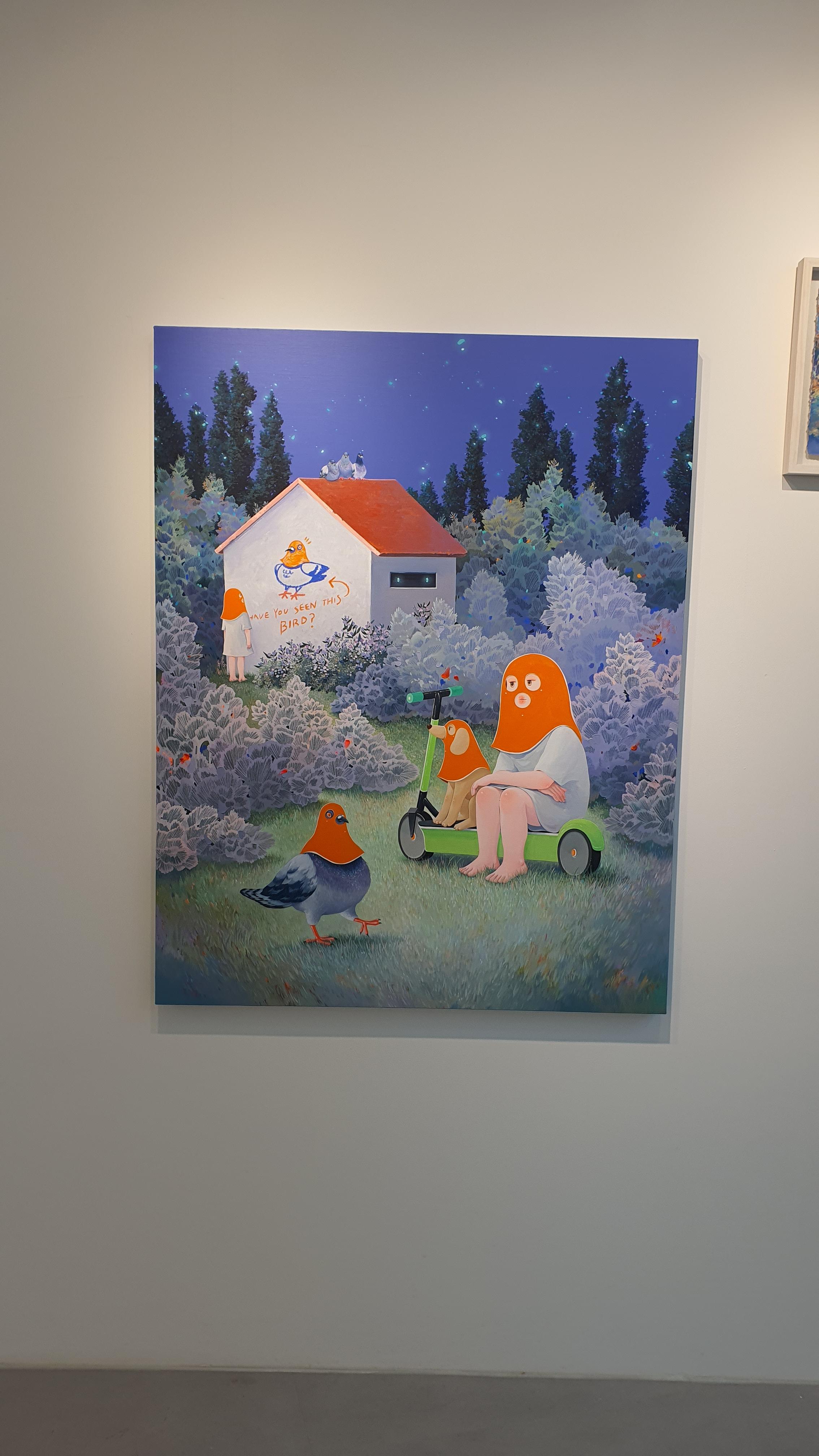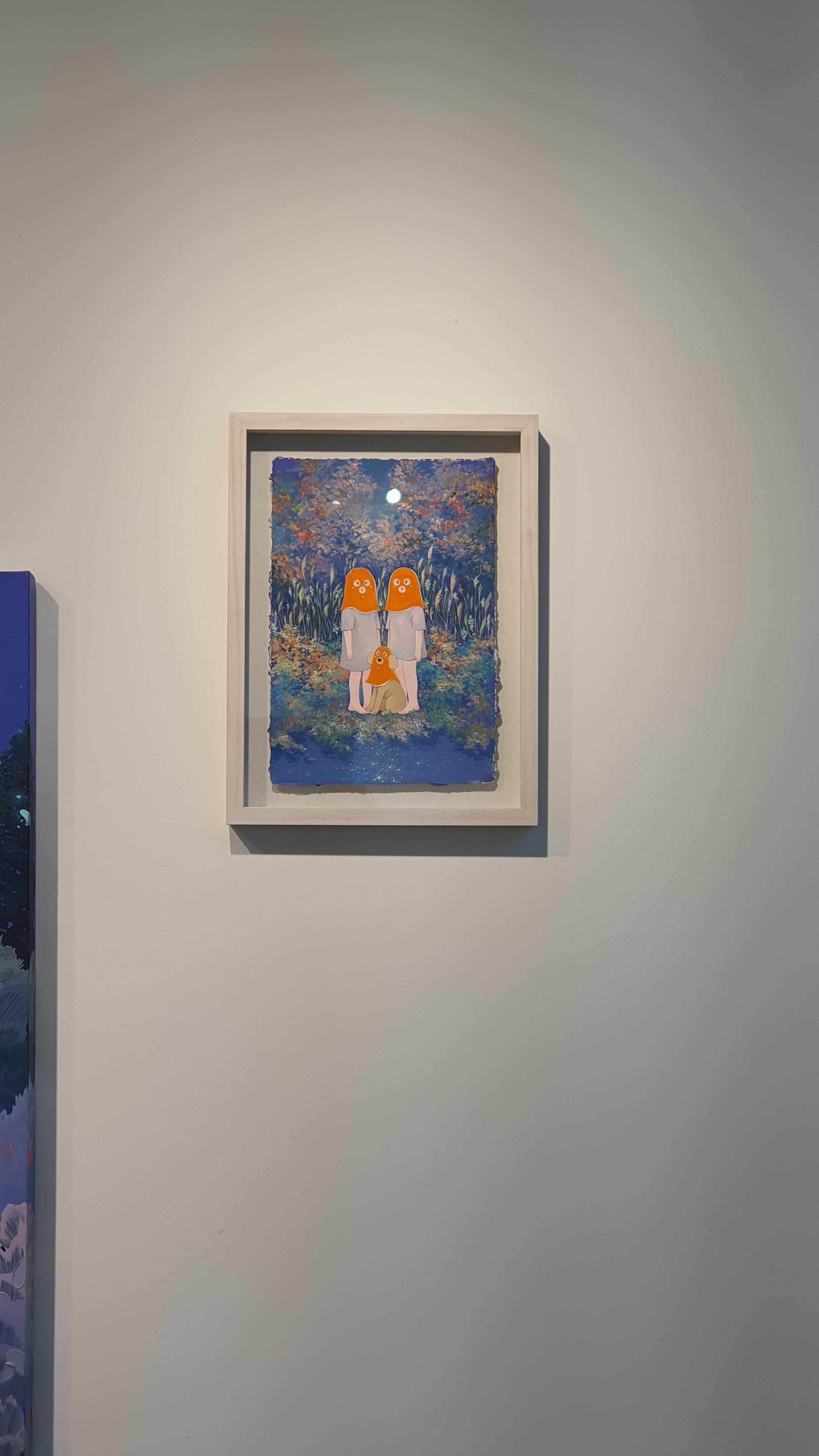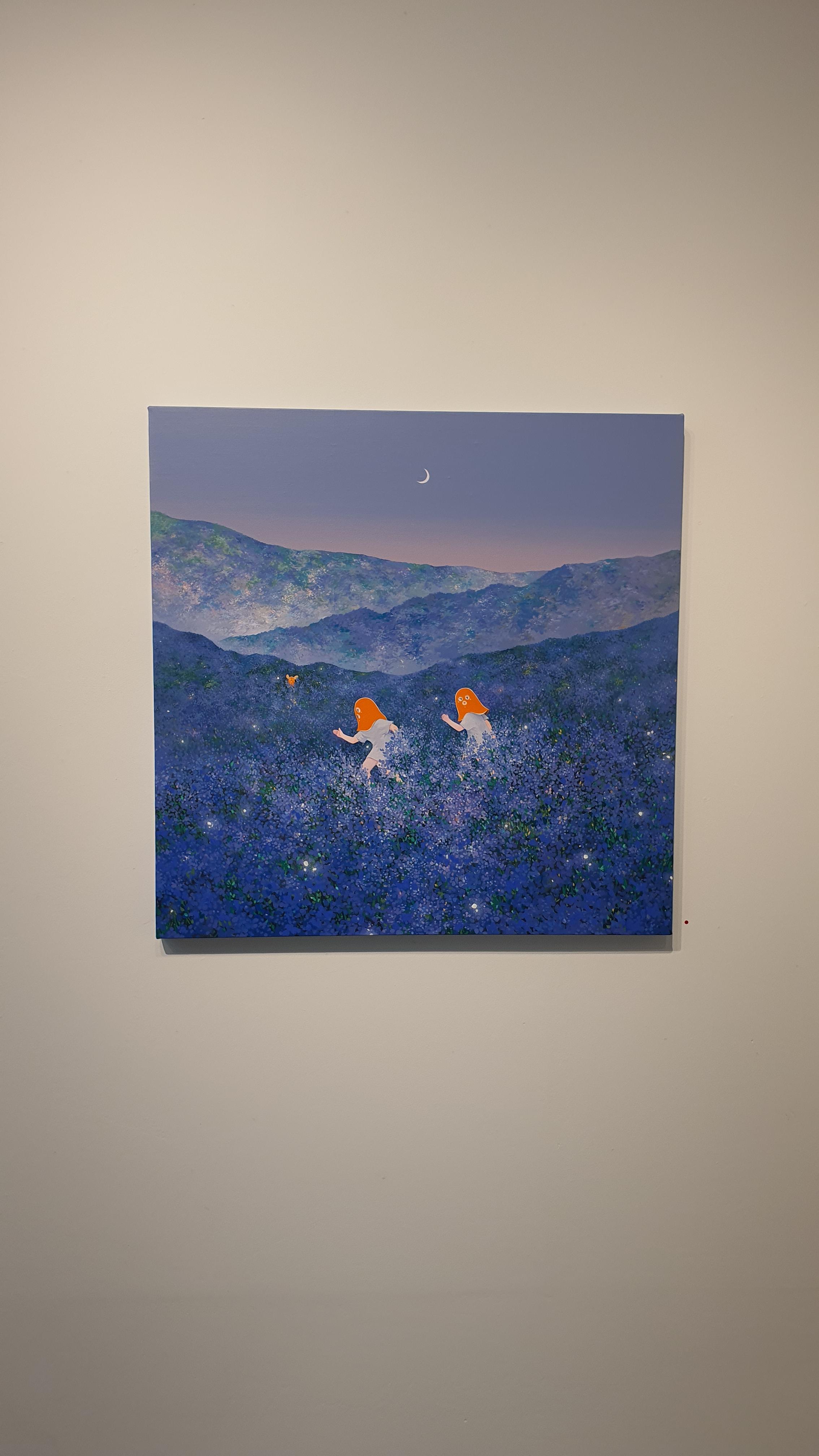 작가의 <Twisted World> 연작의 이전 작업에서 시선을 사로잡았던 것은 넓은 면적의 파란 바탕과 색연필로 긁어 효과를 주었다는 부챗살 모양을 한 오묘한 빛깔의 식물 군집이었다. 개인전을 거듭할수록 작품의 색은 다채로워지고 복면을 쓴 이들의 옆에 등장하는 존재들이 추가되며 배경은 여유로우면서도 자세하다.