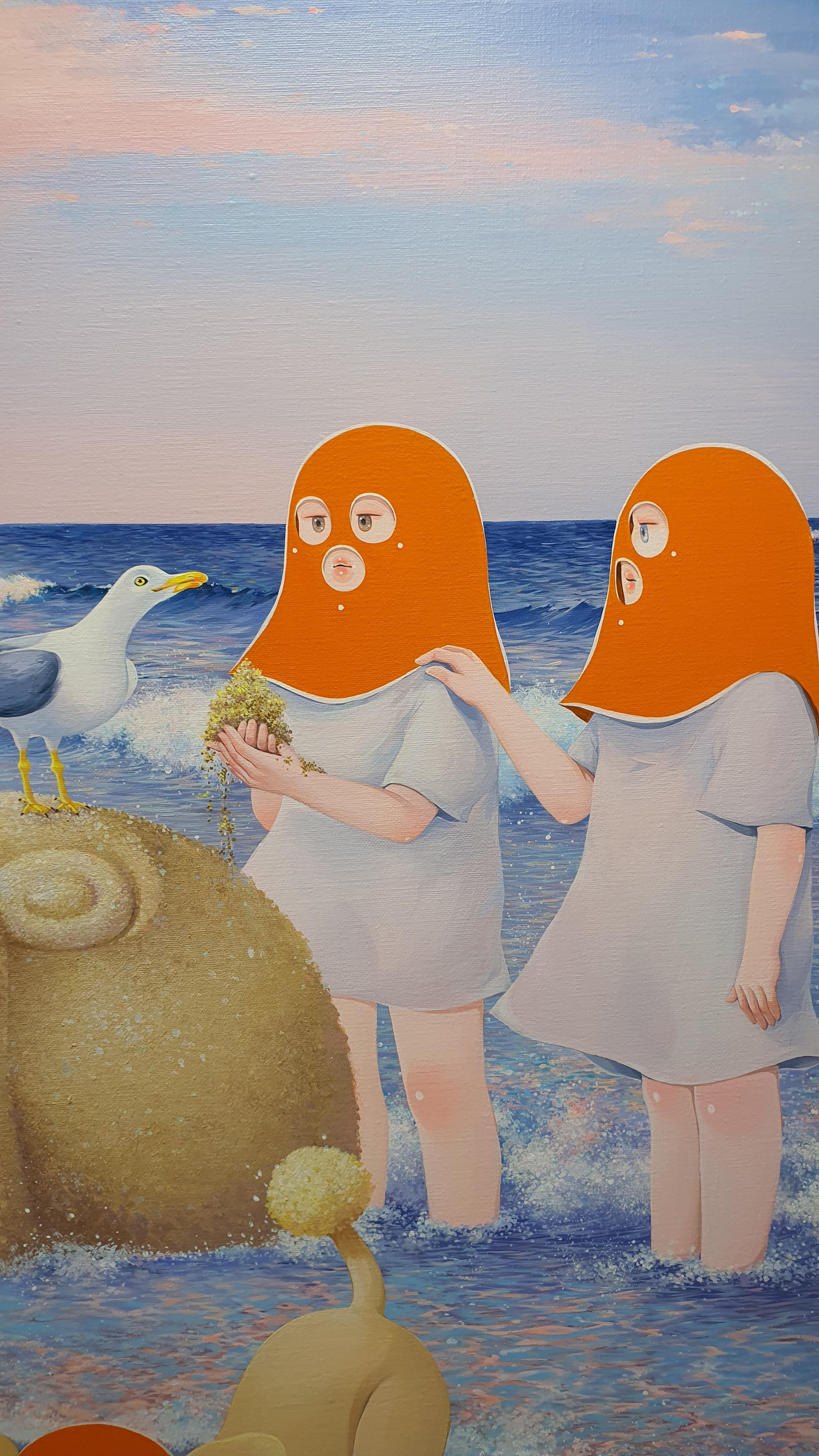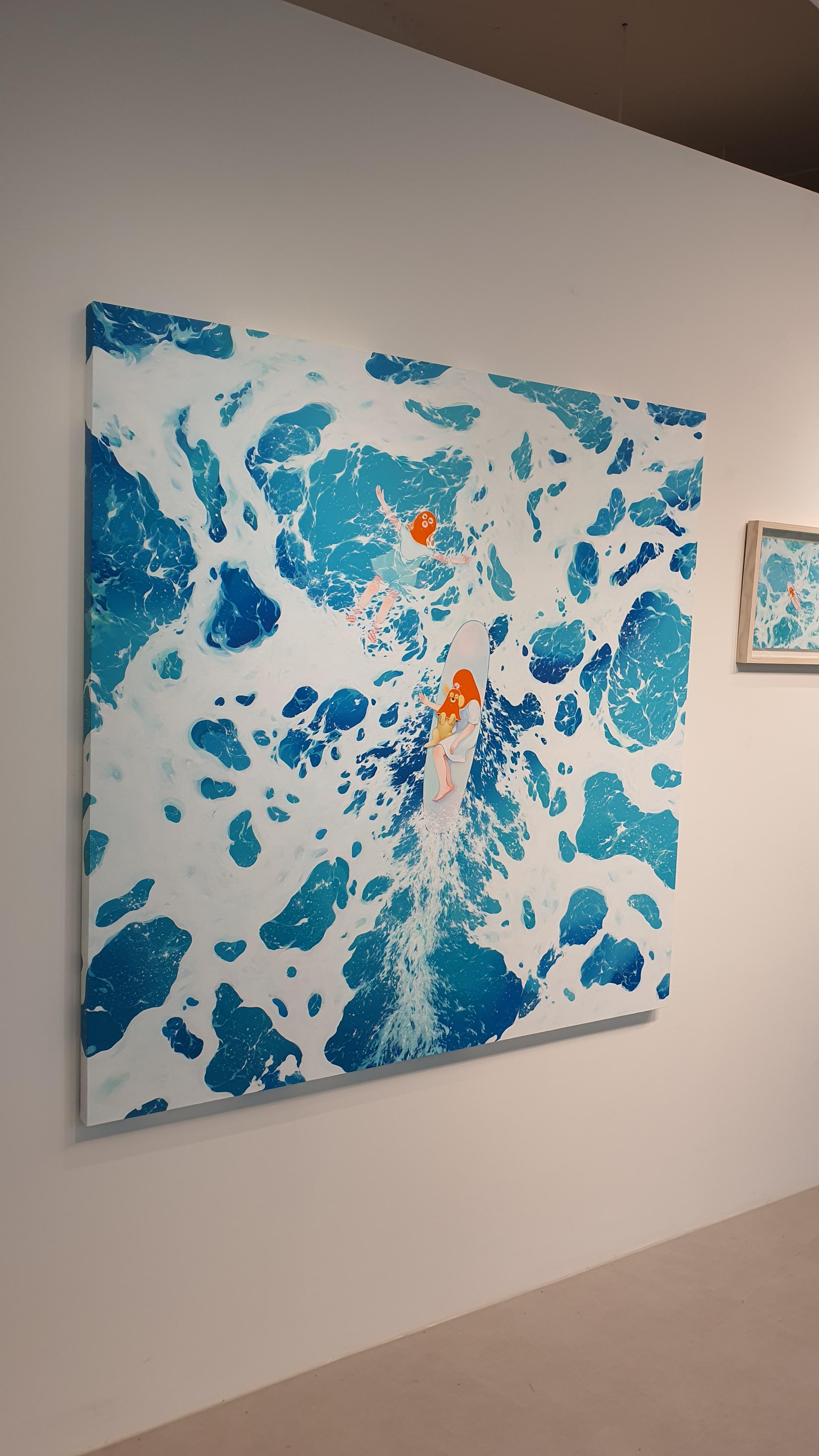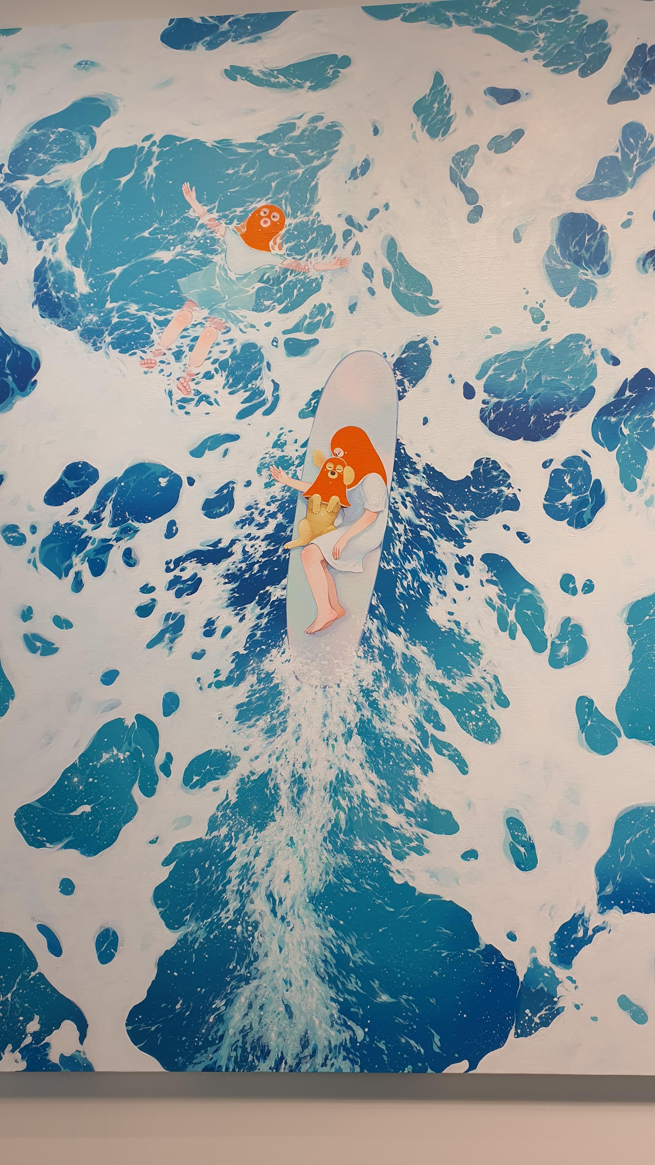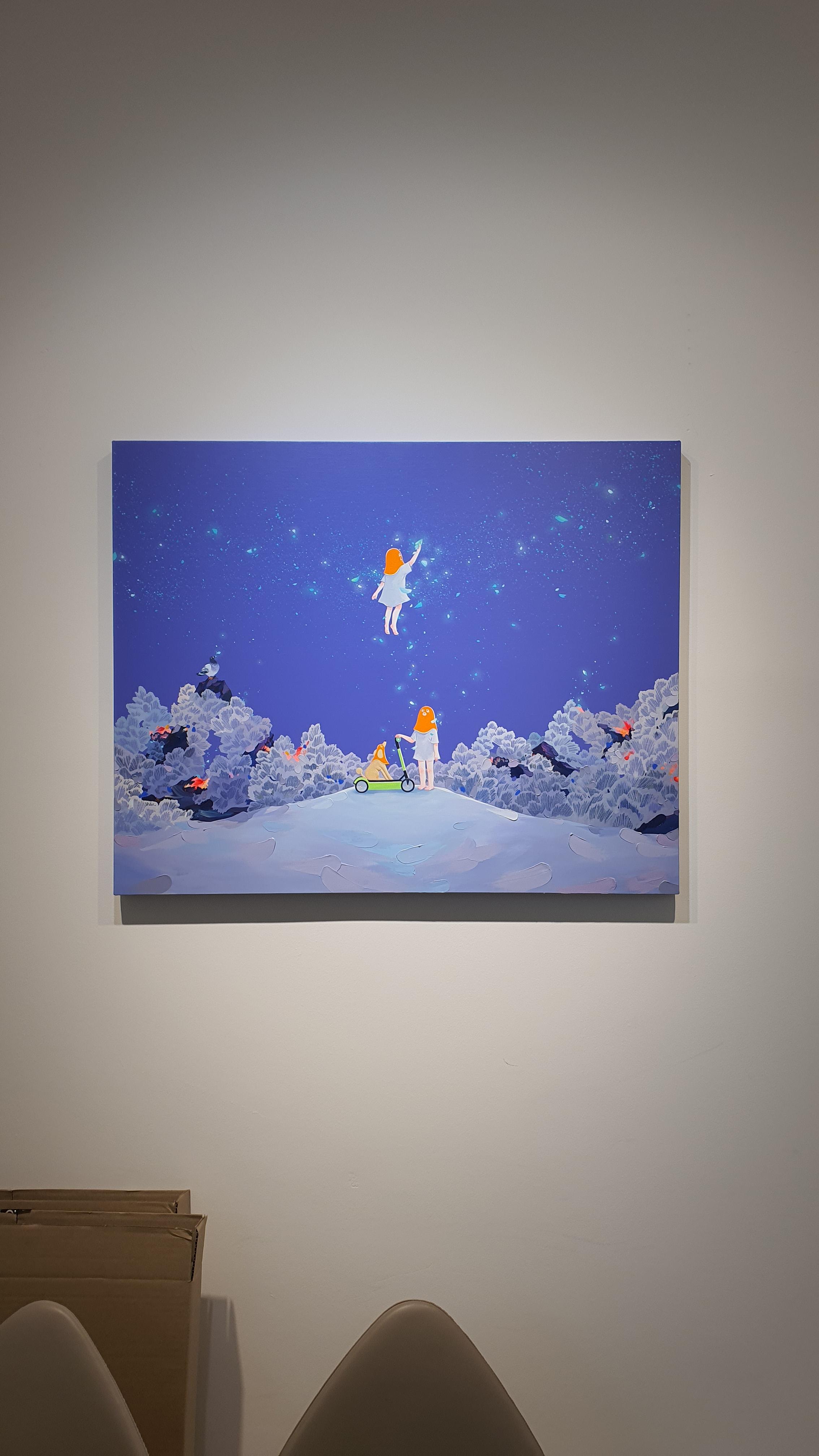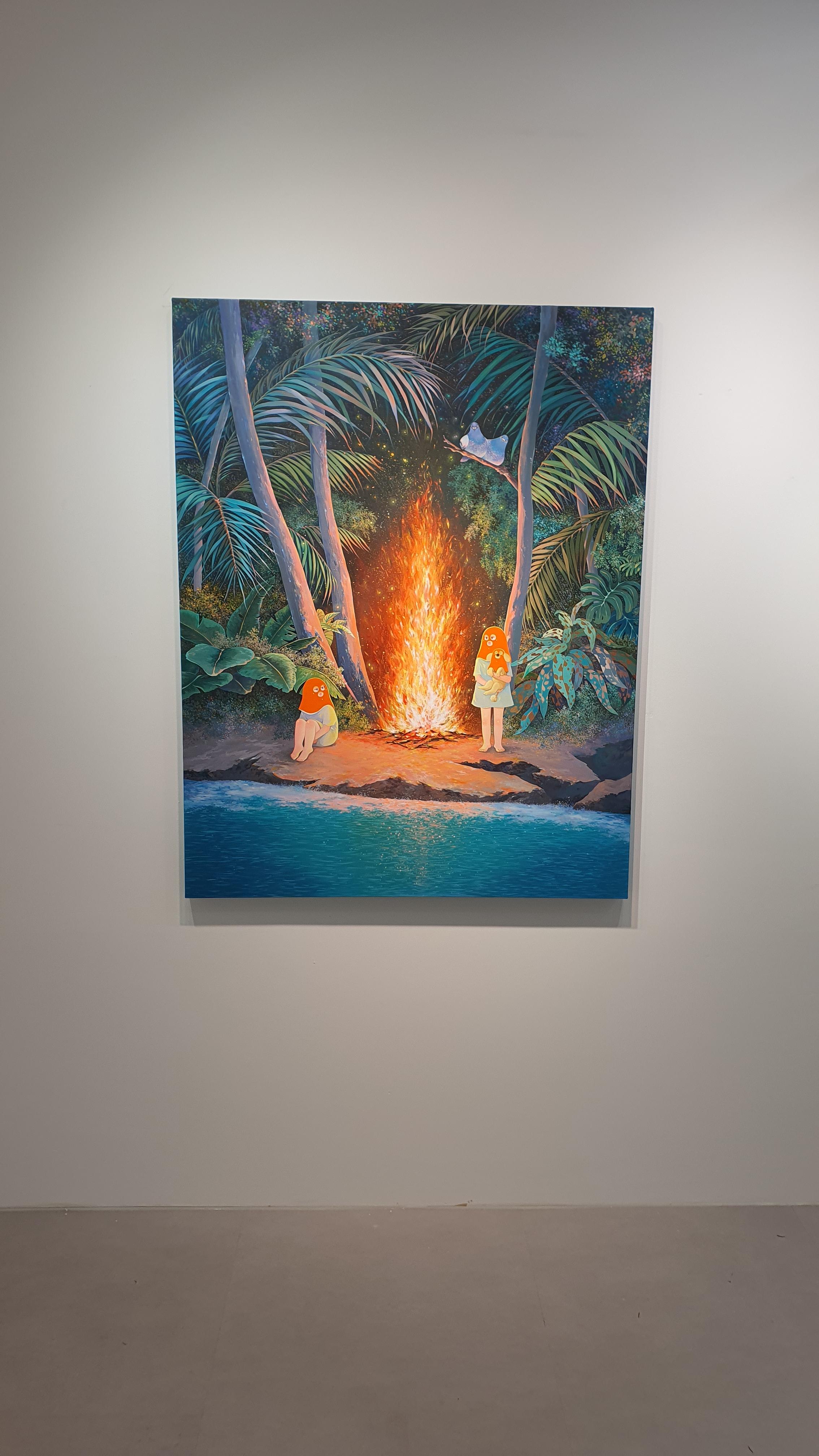 작가의 <Twisted World> 연작의 이전 작업에서 시선을 사로잡았던 것은 넓은 면적의 파란 바탕과 색연필로 긁어 효과를 주었다는 부챗살 모양을 한 오묘한 빛깔의 식물 군집이었다. 개인전을 거듭할수록 작품의 색은 다채로워지고 복면을 쓴 이들의 옆에 등장하는 존재들이 추가되며 배경은 여유로우면서도 자세하다.