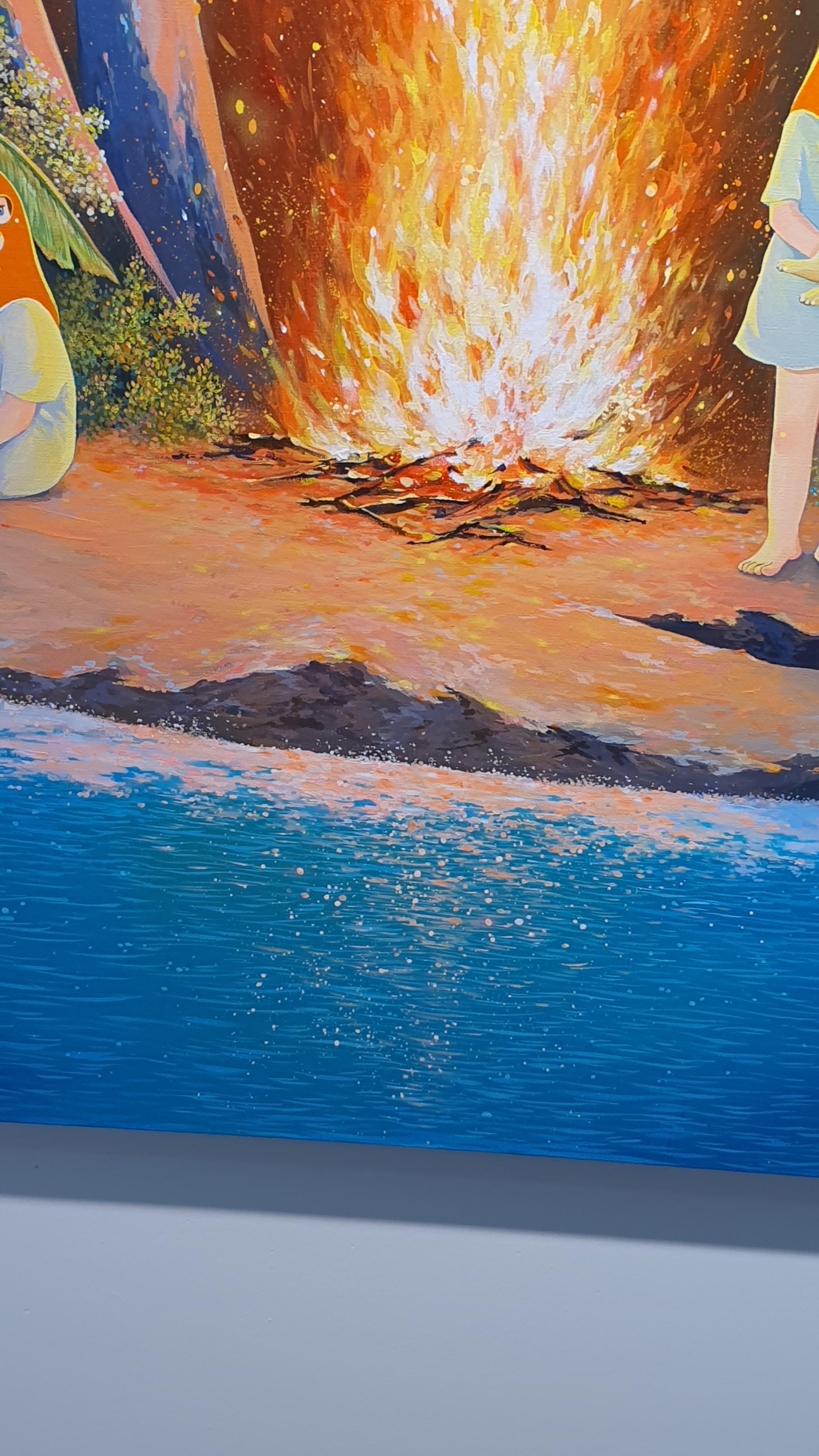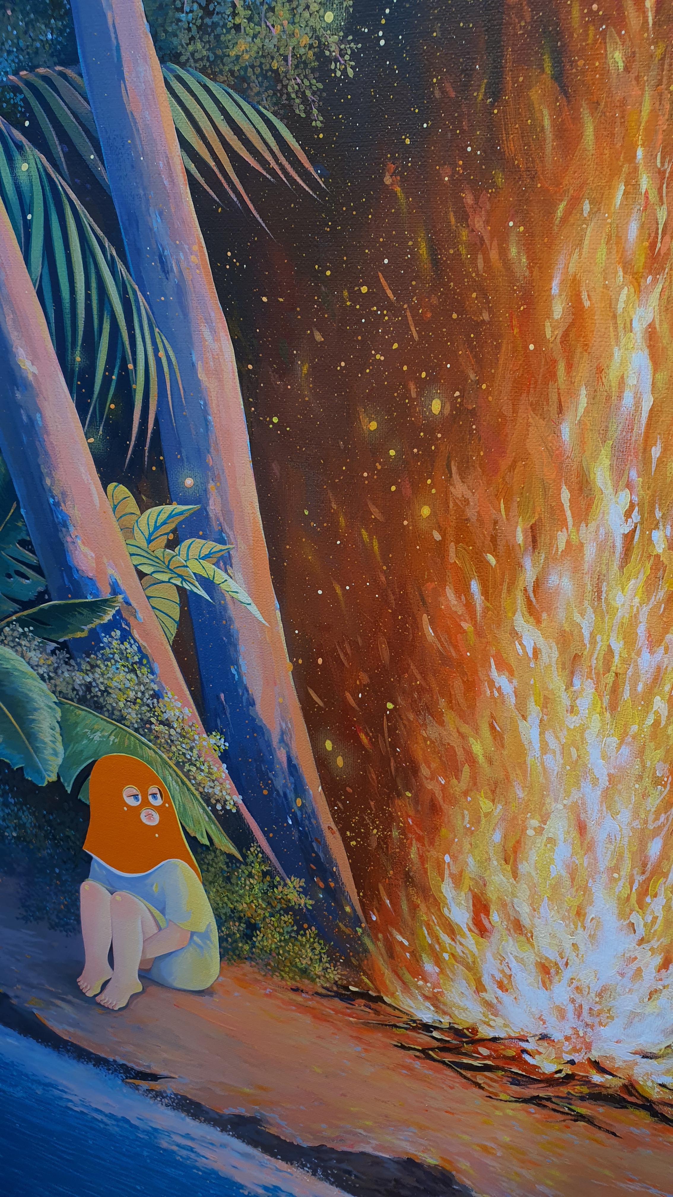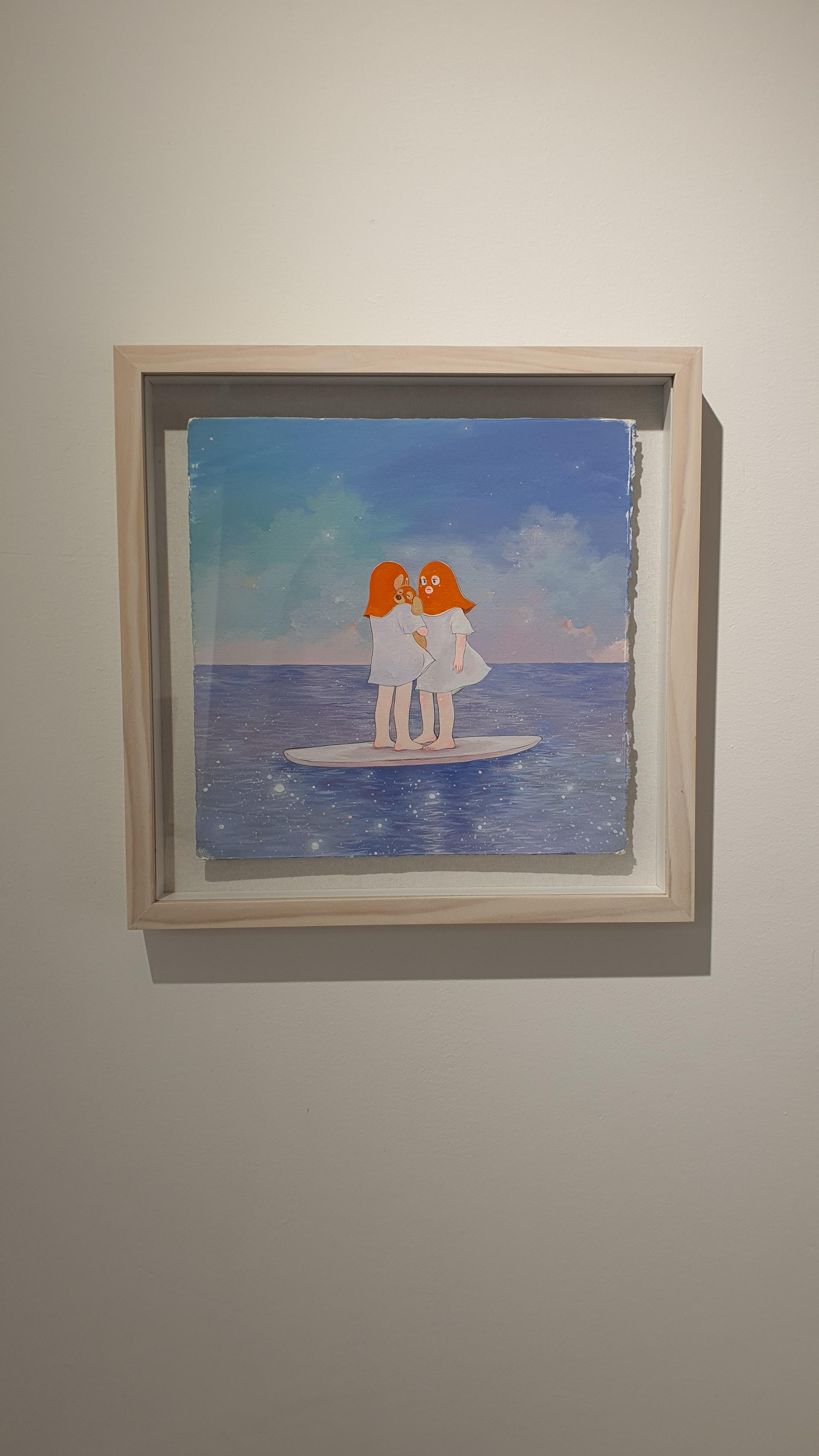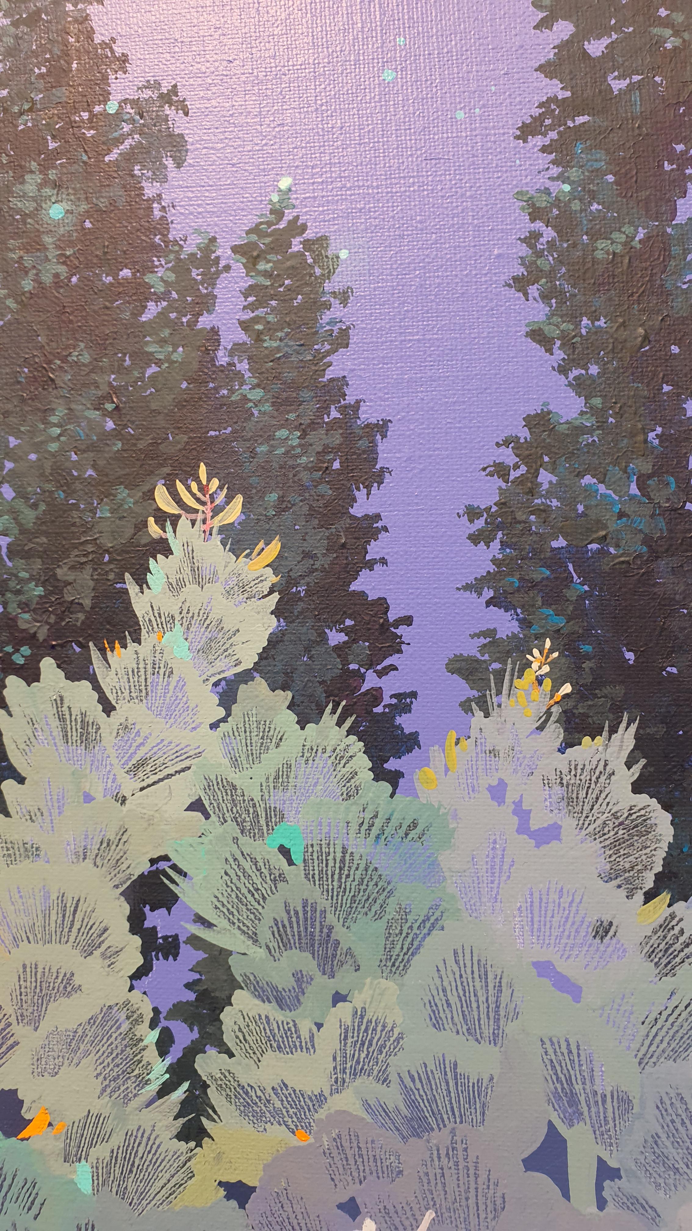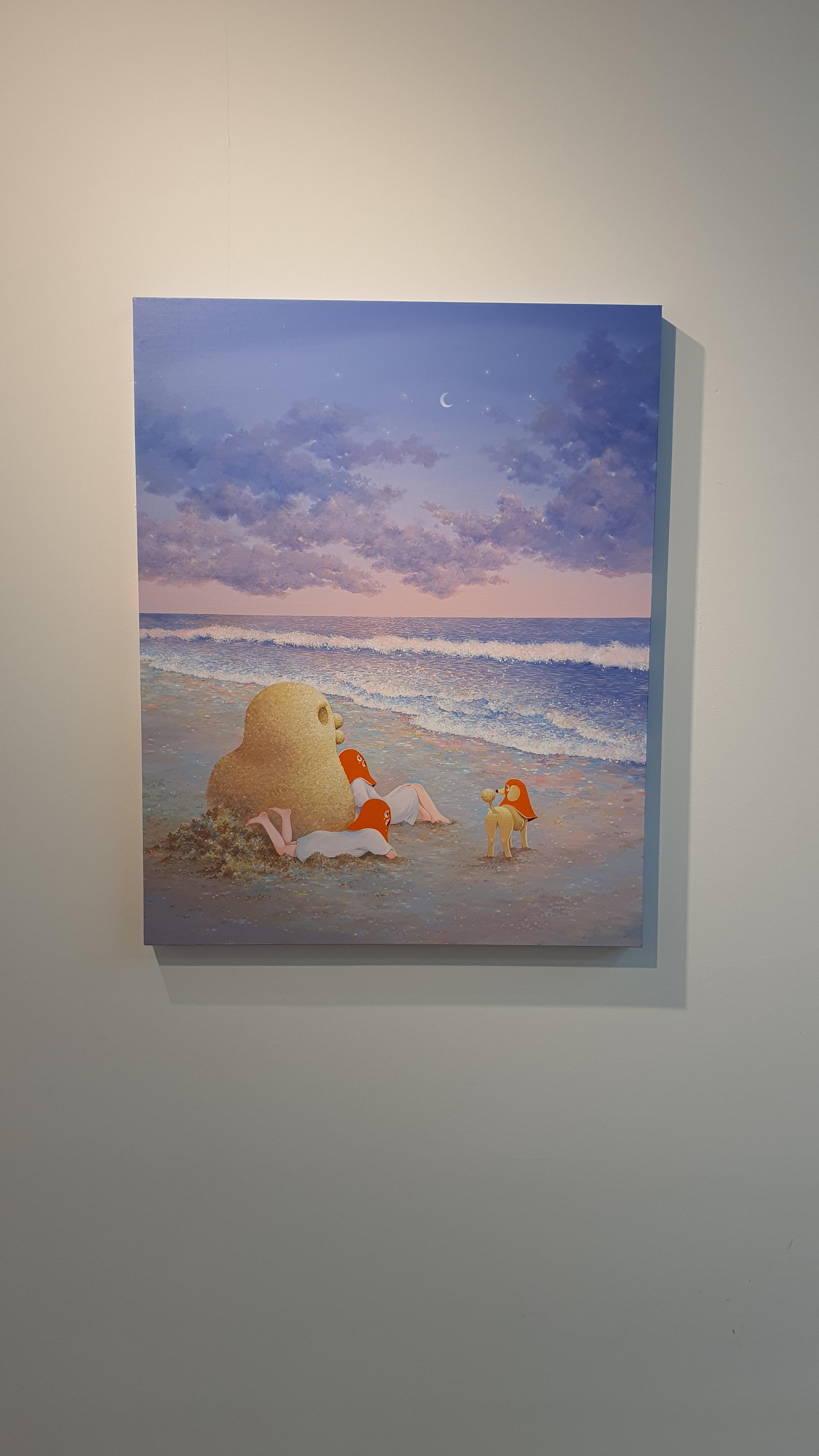 작가의 <Twisted World> 연작의 이전 작업에서 시선을 사로잡았던 것은 넓은 면적의 파란 바탕과 색연필로 긁어 효과를 주었다는 부챗살 모양을 한 오묘한 빛깔의 식물 군집이었다. 개인전을 거듭할수록 작품의 색은 다채로워지고 복면을 쓴 이들의 옆에 등장하는 존재들이 추가되며 배경은 여유로우면서도 자세하다.